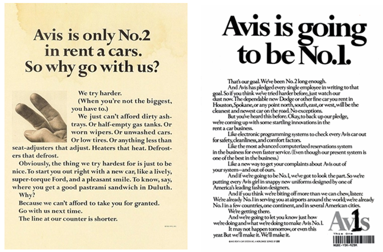 이와 비슷한 사례는 역사적으로도 흔하다. 단점 마케팅으로 유명한 렌터카 업체 아비스도 2인자 전략으로 큰 성공을 거뒀다. 성공에 심취한 아비스는 이후 렌터카 시장에서 1위로 올라서고 싶어 했다. 곧 그들은 입장을 바꾼 광고를 내보냈다.