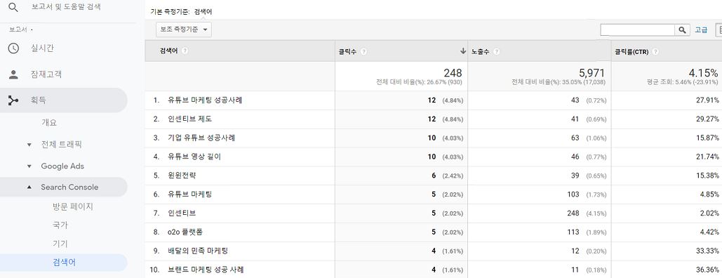 서두에 언급했듯이 구글의 검색 유입량을 늘리기 위해 구글 SEO 전략은 필수로 이루어져야 한다. 그러나 위의 화면처럼 데이터가 분명치 않다면 당연히 제대로 된 데이터 분석 마케팅을 할 수 없다. 특히 브랜드 관련 값이 높은 키워드일수록 자연 검색어에 걸릴 확률이 높기 때문에 마케터라면 특히 구글 서치 콘솔의 연동은 필수가 되는 것이다.