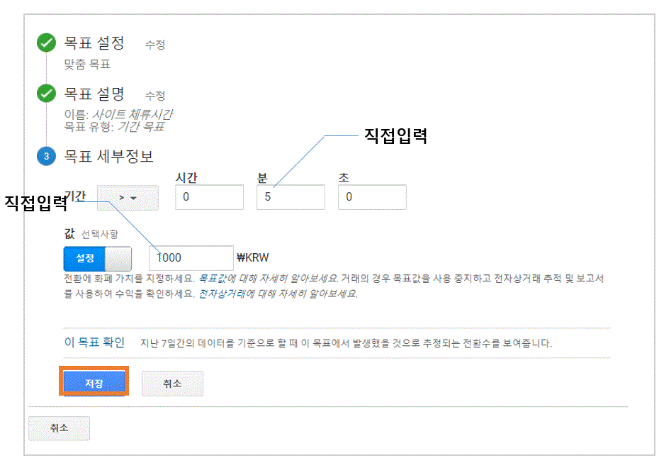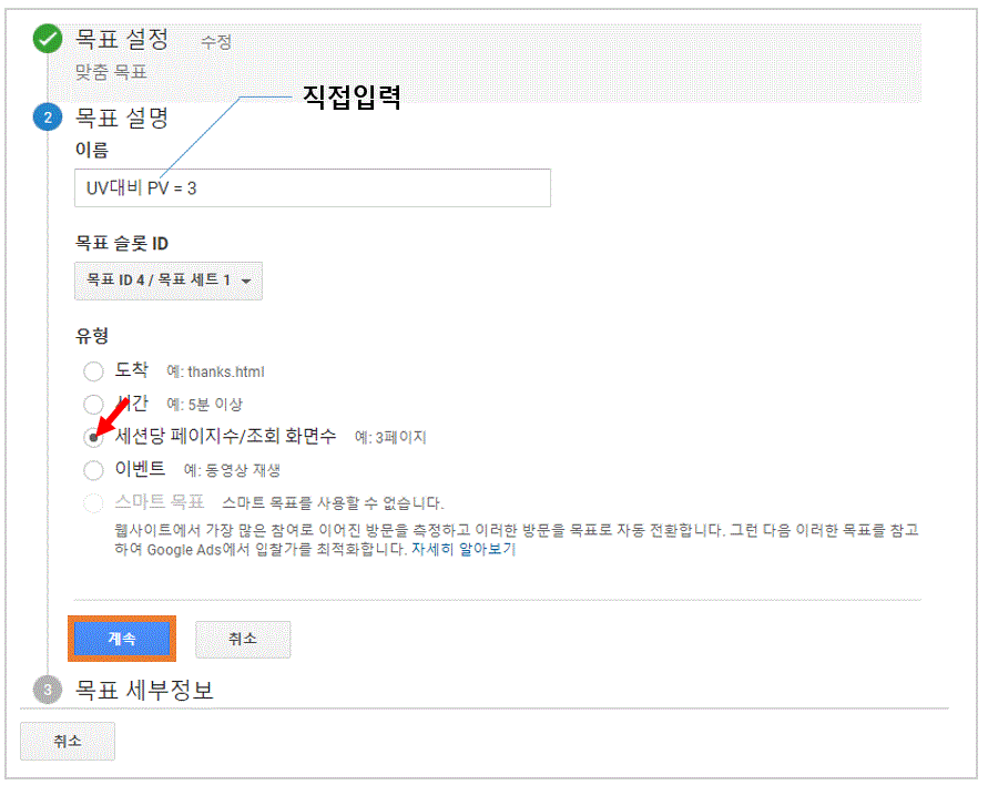 목표 세부정보에 섹션당 페이지 수/조회 화면 수에 '3'을 직접 입력하고 목표 값을 입력해준다.