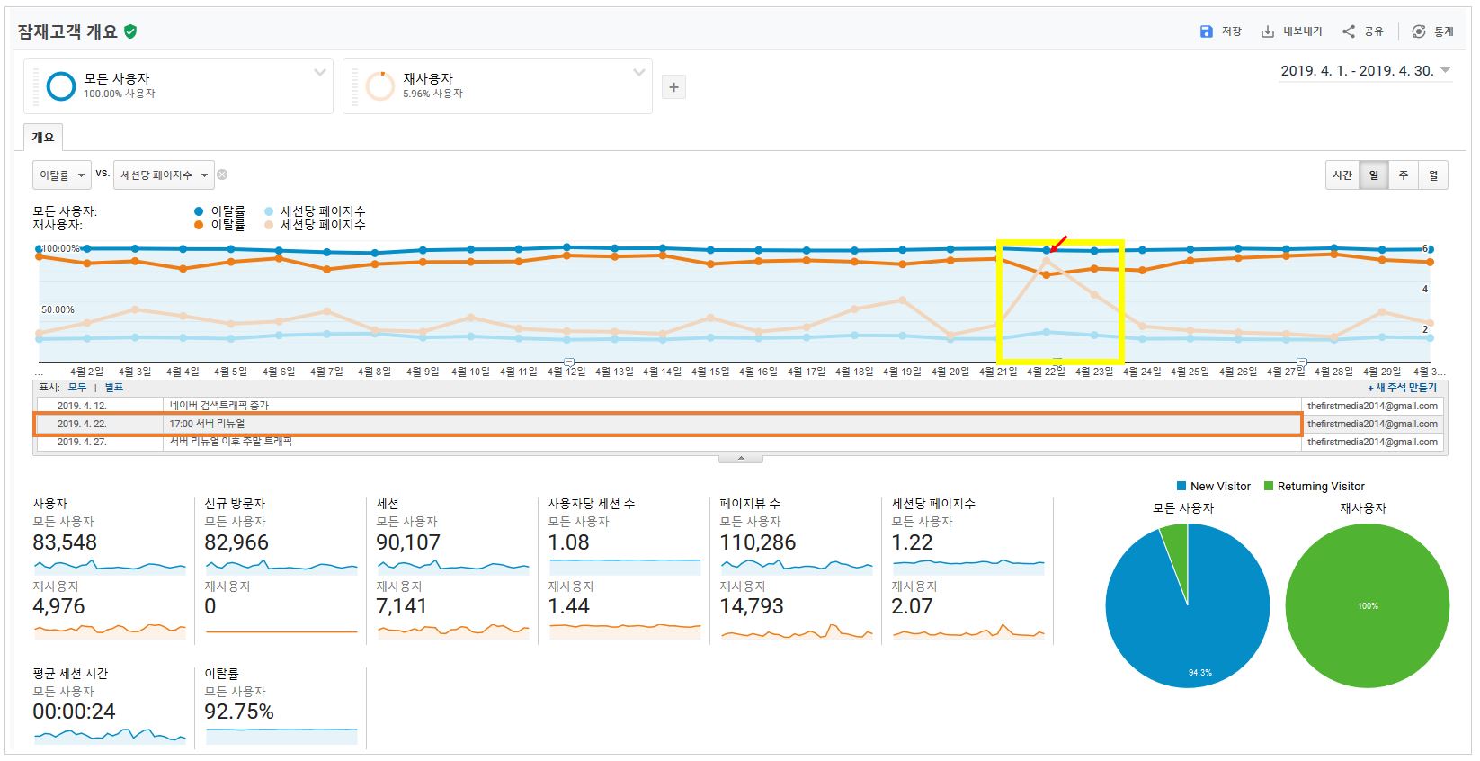 아래 데이터 표는 실제 현업에서 관리 중인 미디어 업체의 데이터 변화 현상을 주석처리 해놓은 화면이다. 4월 22일에 사용자 이탈률과 세션당 페이지뷰 수가 비약적으로 증가했는데, 주석을 확인하면 이날 웹 사이트 리뉴얼 작업이 끝난 것을 알 수 있다.