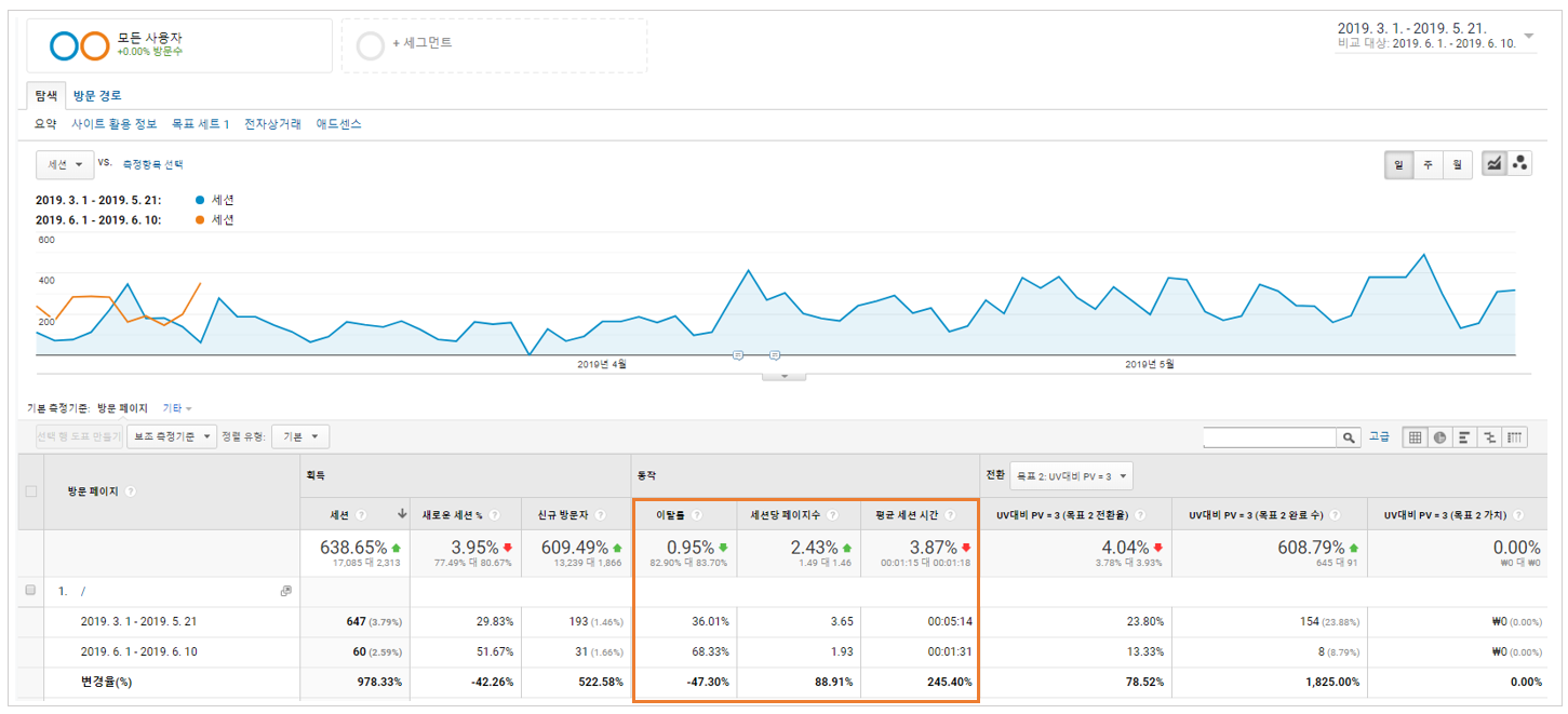 위의 표는 구글 애널리틱스로 해당 블로그의 메인 페이지 데이터를 가져온 것이다. 여기서 중점으로 봐야 할 것은 6월 1일부터 10일간의 이탈률 지표다. 지난 3월부터 5월까지는 평균 36%의 이탈률을 기록 중이었다. 그런데 6월 들어 10일간 무려 32%나 오른 68%까지 이탈률이 치솟았다. 세션당 페이지 수와 평균 세션 시간 또한 이전 데이터에 비해 상당히 안 좋은 지표를 보이고 있다.
