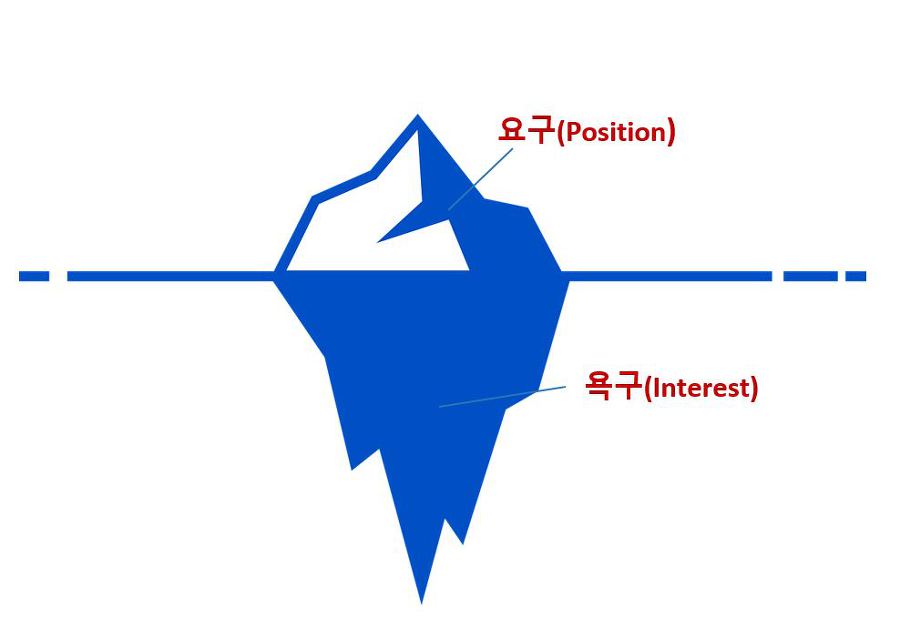 요구(Position)는 빙산의 일각이다. 상대방의 내면에 있는 욕구(Interest)를 찾아내는 것이 중요하다