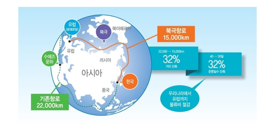 이는 기존 항로인 수에즈 운하보다 거리가 30%나 줄어든 거리다. 현재 40일에 걸리는 거리를 신항로를 통하면 28일만에 목적지에 도달하게 된다. 즉 과거 일본이 무역항을 통해 패권의 길을 열었던 것처럼 한반도에도 엄청난 도약의 시대가 열리게 될지도 모르는 인류사적 사건인 것이다.